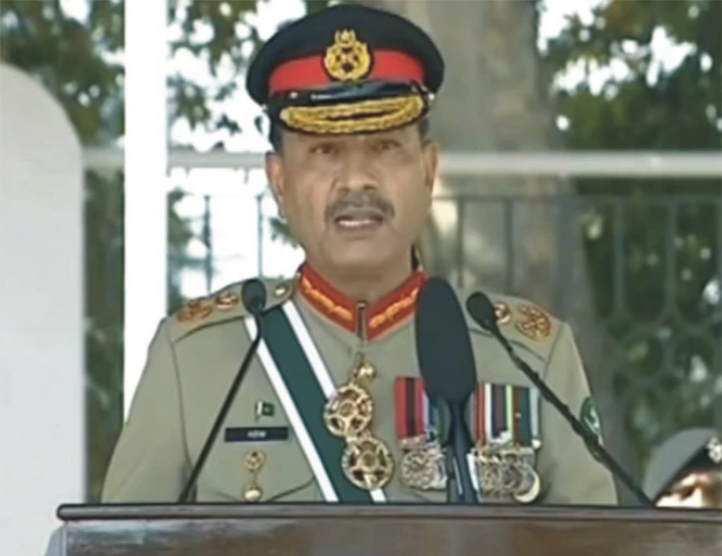 آرمی چیف نے کہا کہ ہم شہداء اور ان کے اہلِ خانہ کے بے حد شکر گزار اور مقروض ہیں، جن کی قربانیوں کی بدولت آج ہم آزادی کی زندگی گزار رہے ہیں، آپ شہداء کے وارث ہیں، اپنی زندگی کو ان کی یاد کے شایانِ شان بنائیں، آپ کو فخر ہونا چاہیے کہ آپ دنیا کی ایک عظیم اور باوقار فوج کا حصہ بننے جا رہے ہیں، جو کسی سے کم نہیں، یاد رکھیں، ہمارے دشمن اپنے مذموم مقاصد کے لیے ہمارے عوام اور مسلح افواج کے درمیان دراڑ ڈالنے پر تلے ہوئے ہیں۔